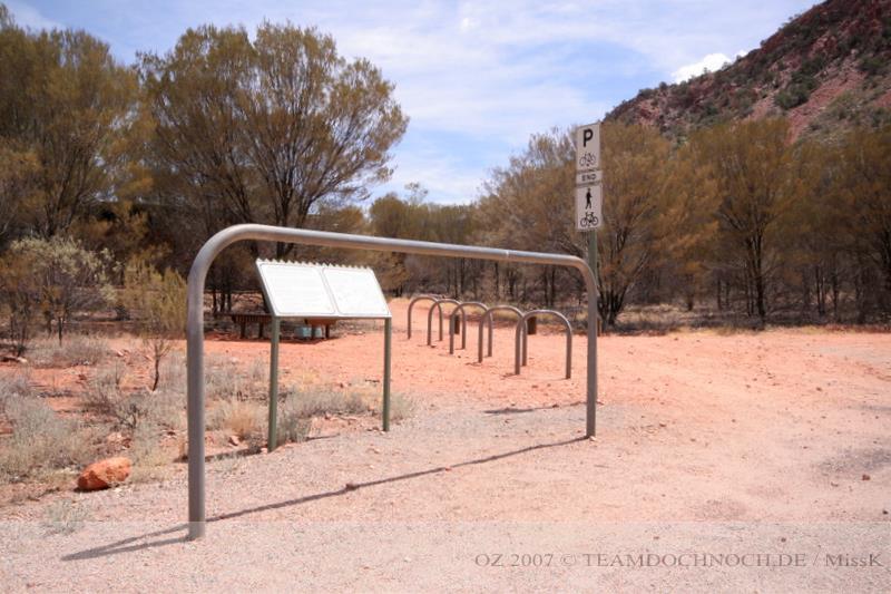 Unser nächstes Ziel soll das Simpson Gap sein, eine schmale Schlucht etwas westlich der Stadt. Unseren Plan mit dem Bike dorthin zu fahren, verwerfen wir allerdings, da es inzwischen wieder über 40°C sind und der Weg auch nur eine Route hat, der Rückweg also über den selben Weg verläuft oder auf der Straße.