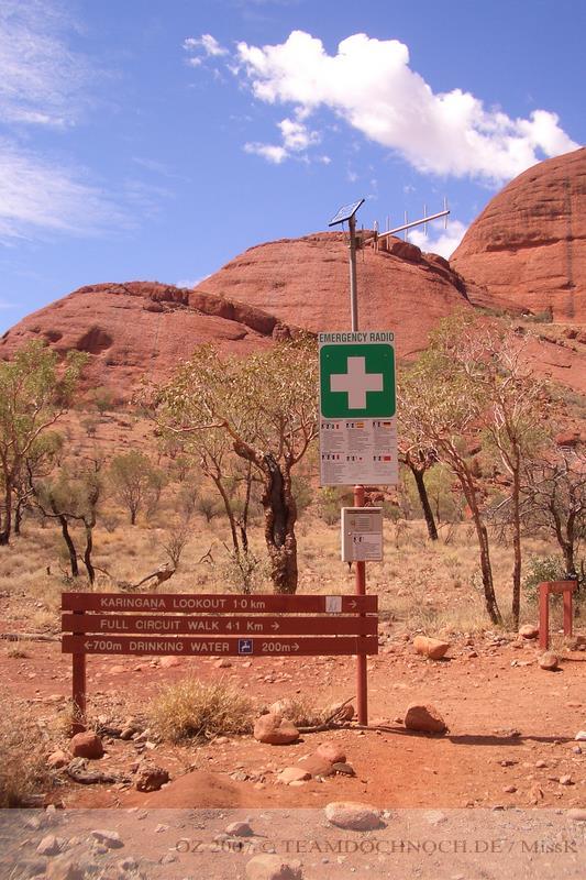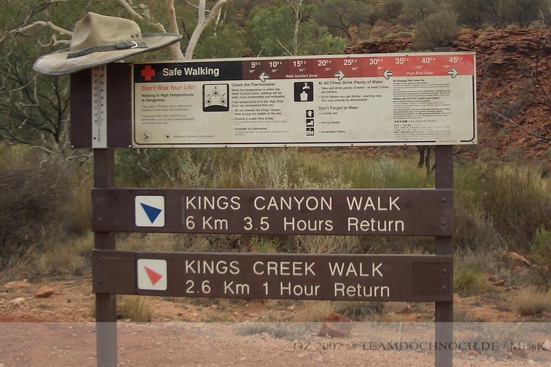 Wenig später auf dem Parkplatz für das Valley of the Winds stehen nur wenige Autos und ein kleiner Bus. Die Wanderung ist in 3 Stufen unterteilt, zum ersten Lookout 1 km und 1h, markiert als leichter Weg, zum 2.Lookout sollen es weitere 1,6km und 1h return sein und die Loop ist insgesamt 7,4km. Diese beide Wege sind als schwer eingestuft.