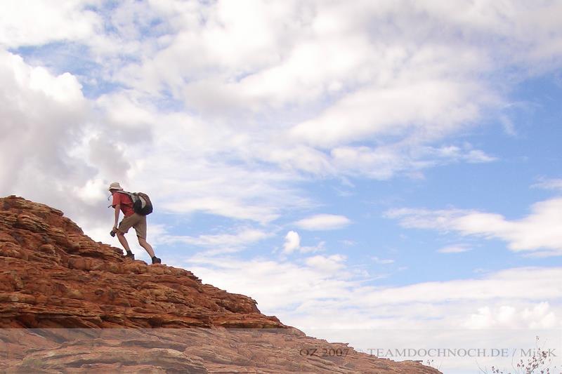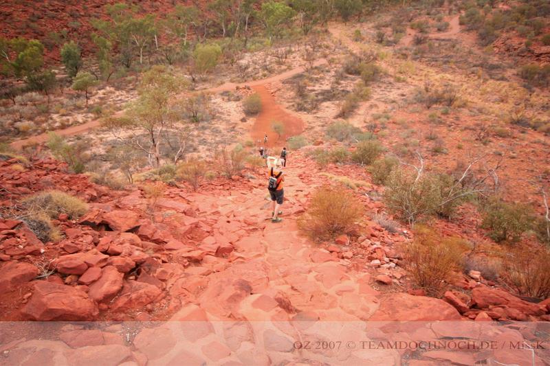 Uns kommen immer wieder einzelne Paare entgegen und kurz vor dem zweiten Lookout sehen wir eine kleine Reisegruppe. Deren Führer erzählt gerade etwas über die Riesenkängurus, wie sie 60 km/h Höchstgeschwindigkeit erreichen und mehr als 6m springen können und zum Schluss auch noch über ihre Boxkämpfe.