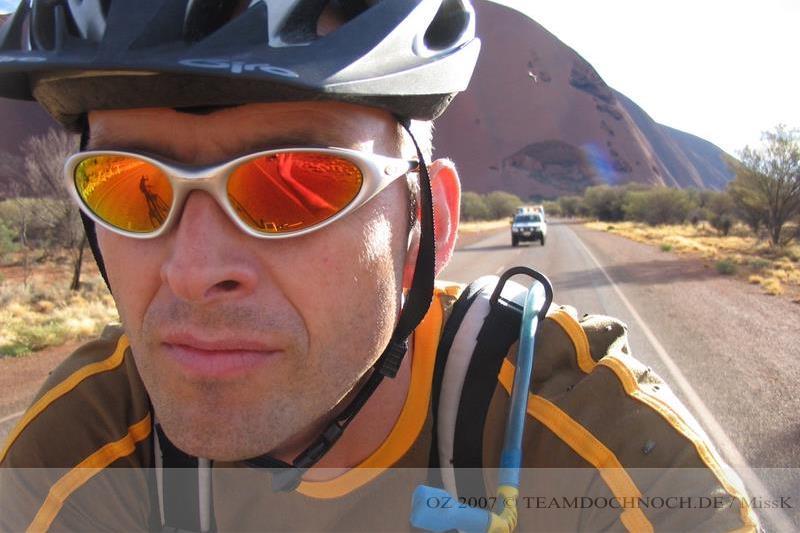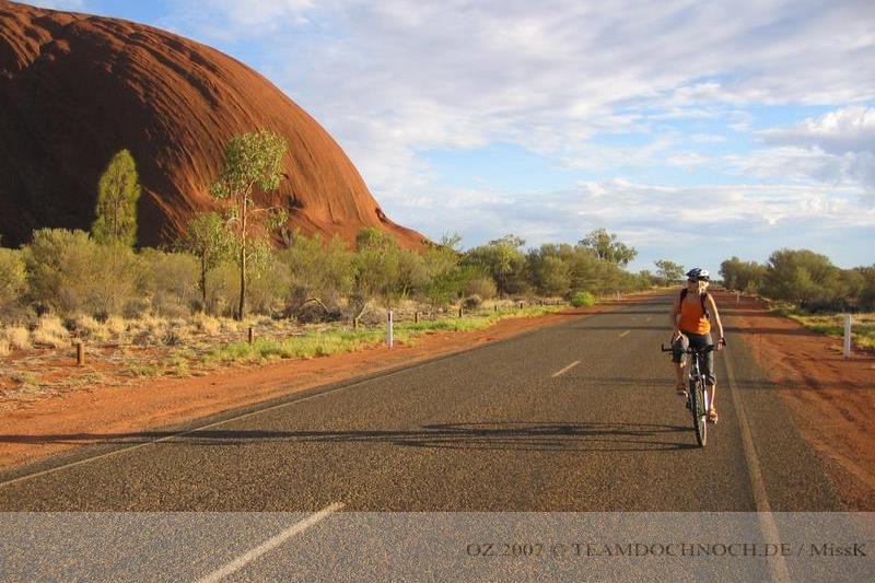 Kurz danach kommt uns ein einsamer Radfahrer entgegen. Wie es aussieht ein Japaner, der mit relativ wenig Gepäck reist. Der erste Radtourist im Red Center soll übrigens bereits 1893 hier unterwegs gewesen sein.
