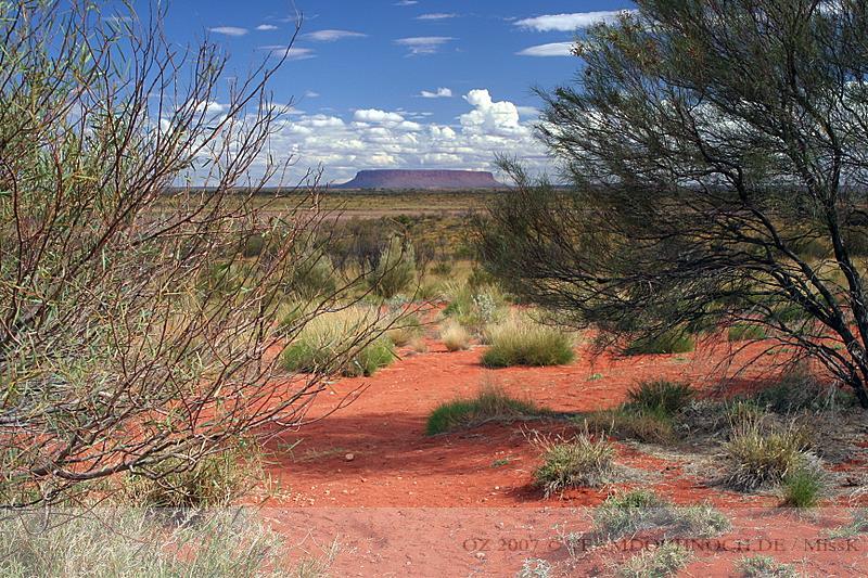 Central Mount Stuart - mit 846 Metern über dem Meer und nur gut 200 über der Umgebung ist es keiner der ganz großen australischen Berge. Berühmtheit erlangte der Berga ber dadurch, daß der Forscher John McDouall Stuart den geografische Mittelpunkt Australiens nur 4 Kilometer von ihm entfernt ausmachte. Von den modernen Geografen wird diese Meinung allerdings nicht geteilt. (Central Mount Stuart)