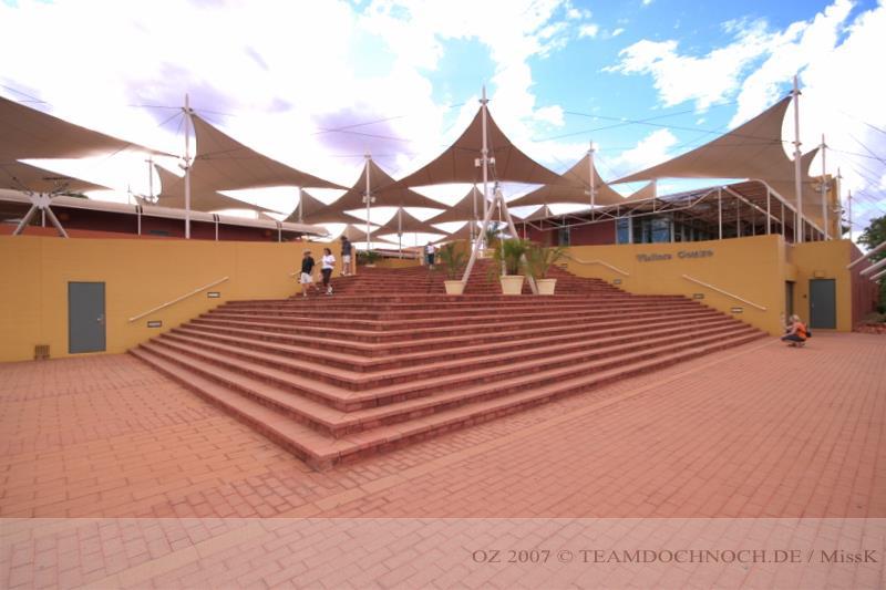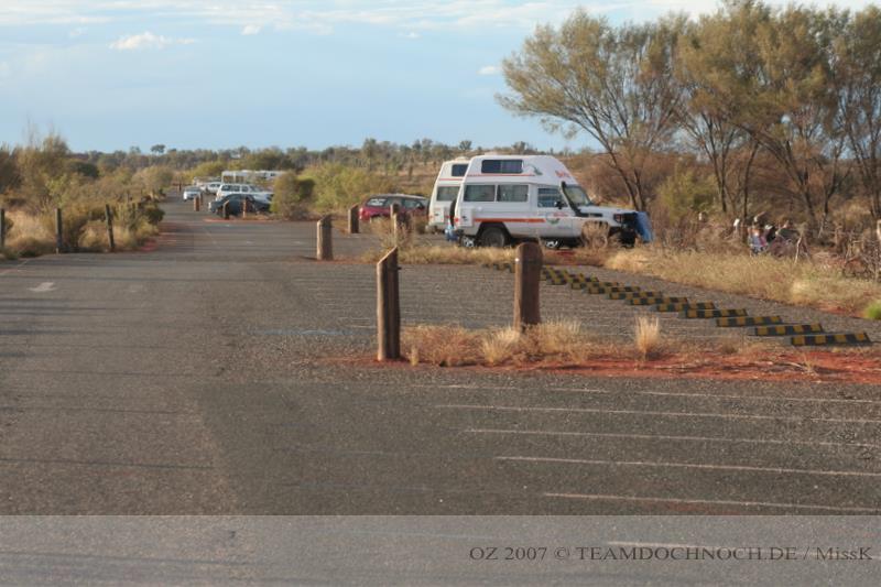 In Yulara kommen wir gerade rechtzeitig um die Damen vom Besucherzentrum zu sehen, wie sie die Tür verschließen und nach Hause gehen - es schließt bereits um 17.00. Ansonsten ist alles hier voll durchorganisiert, es gibt Hotels, Tankstelle, Supermarkt und Kneipen, also alles was der moderne Traveller heute so braucht. Der Zeltplatz kostet unpowered wieder 13 für jeden, hat nicht mehr ganz den neuesten Zustand, ist aber noch o.k.