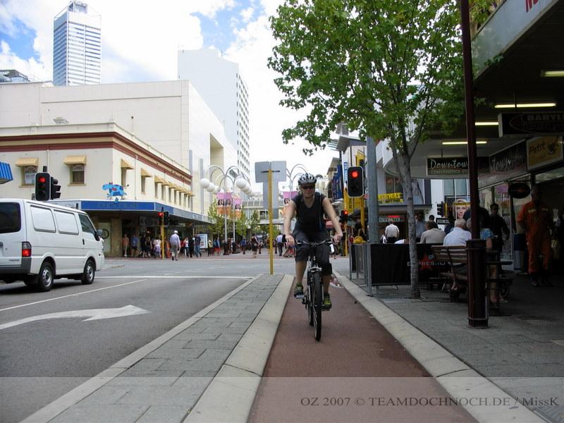 Am nächsten Morgen wollen wir eine kleine Runde durch Perth drehen (es sind nachher ca. 9Kilometer). Da das Hotel unmittelbar in der Nähe der Fußgängerzone liegt, erliegen wir gleich einem kleinen Kaufgelüste. Zunächst shoppen wir neue Badeschlappen für MissK.