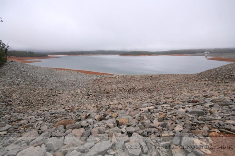 Im daneben liegenden Pub / Liquidstore kaufen wir noch zwei Bier. Dann rauschen wir endlich mal etwas weiter, kommen bis Harvey, wo im Osten wieder eine Talsperre anzusehen ist. Hier pfeift der Wind und gerade als wir auf dem unteren Parkplatz waren, fängt es an zu schütten.