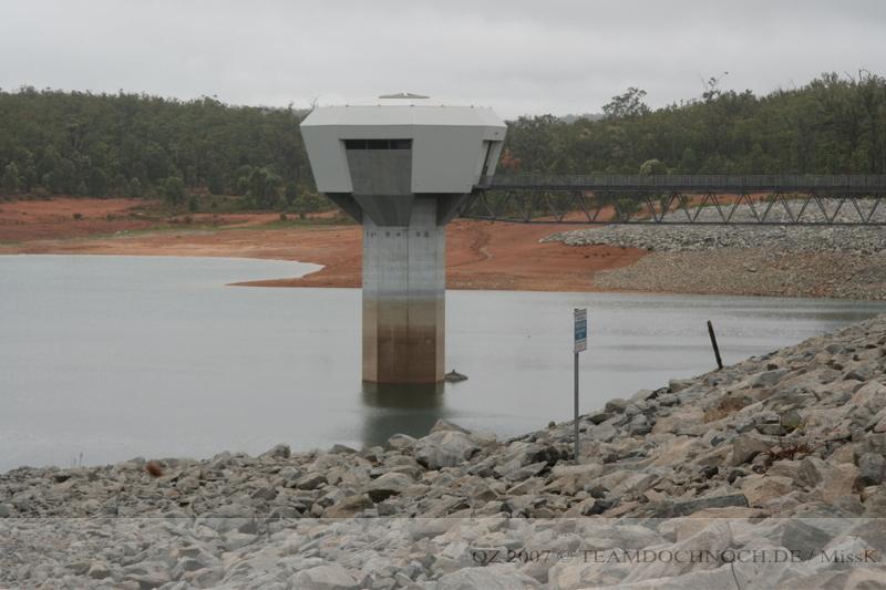 Kurz nachdem wir wieder zurück auf dem Highway sind, verlassen wir ihn ach schon wieder, denn nur wenige Kilometer nach Osten befindet sich der North Dandalup Dam, eine weitere Nutz- oder Trinkwassersperre. Auch hier ist wieder sehr wenig Wasser im See. Alles ist sehr neu und die Hochwasserentlastung riesig. Wir spekulieren wieder darüber, warum sie so riesig ist. Denn die klassischen Berechnungsmethoden aus Europa, wo schon viel länger Daten zum Wetter gesammelt werden, greifen hier vielleicht nicht. Die Hochwasserentlastungsanlage heißt auf englisch spillway.