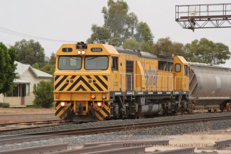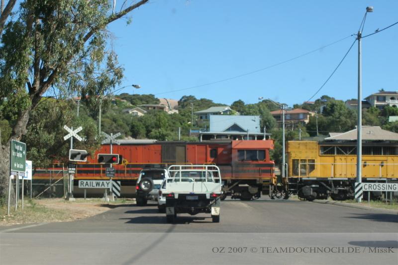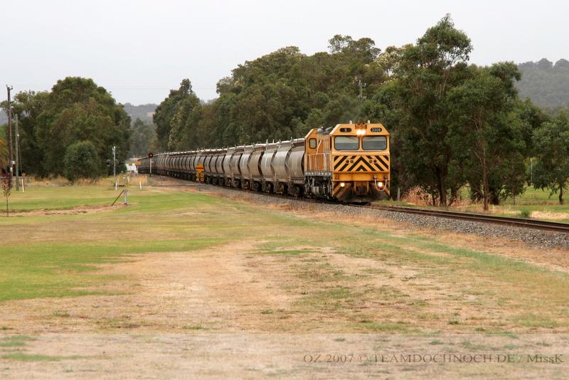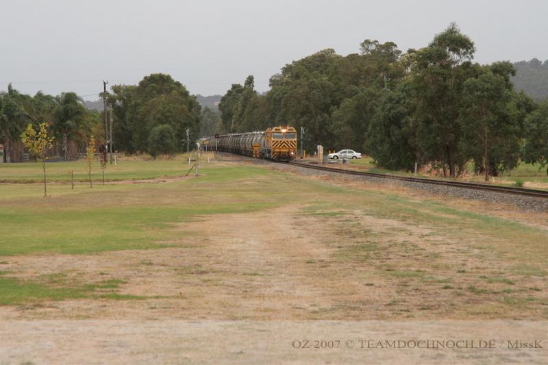 Anschließend ist wieder der 20er unser Weg und es geht weiter nach Süden. Die Bahn ist mal links mal rechts, wir überholen den letzten Zug, der Versuch, ihn zu fotografieren, scheitert jedoch - anscheinend ist er irgendwo stehen geblieben oder abgebogen. Statt dessen sehen wir in Brunswick Junction einen 3-teiligen Triebwagen und den Gegenzug - wieder ein langer mit Getreidewagen.