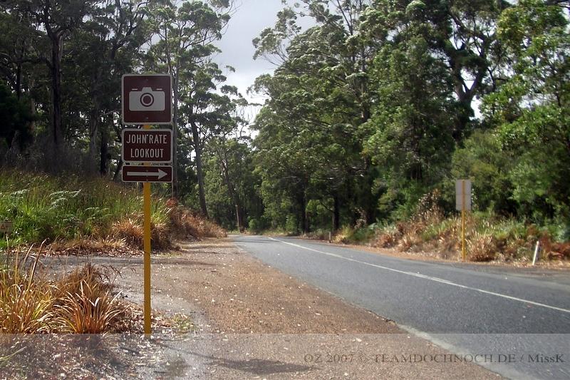 Die Straße führt über viele Kilometer geradeaus durch Weiden und Wald. Im Shannon NP machen wir einen kurzen Abstecher zum Snake Gully Lookout. Vermutlich soll es hier einen guten Blick in ein Tal geben, aber der Bereich unmittelbar vor der Plattform ist so mit dichtem Busch zugewachsen, dass wir den Wald nicht sehen. Beeindruckend sind aber schon hier und auch immer wieder auf der heutigen Strecke die großen Bäume, so dass ich überlege, welche Steigerung es im Valley of the Giants noch geben könnte.