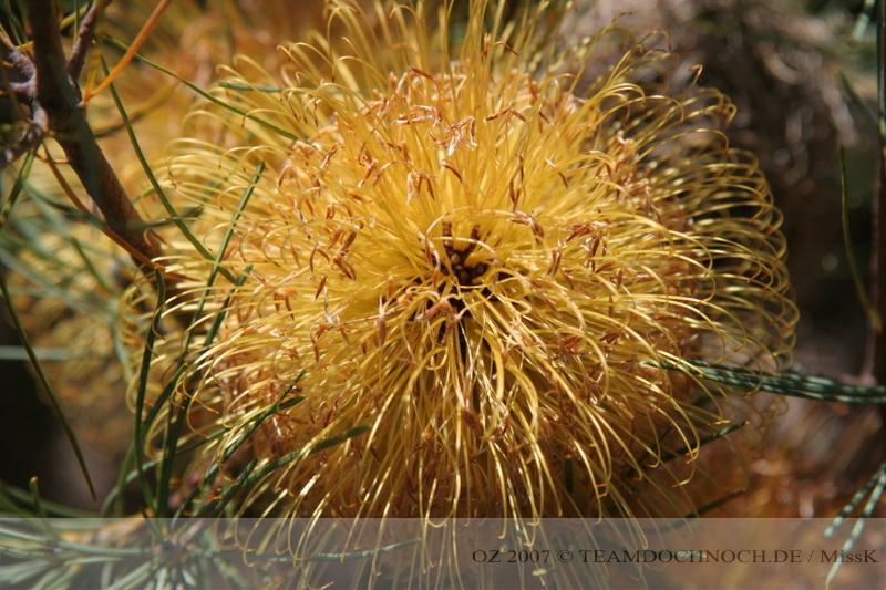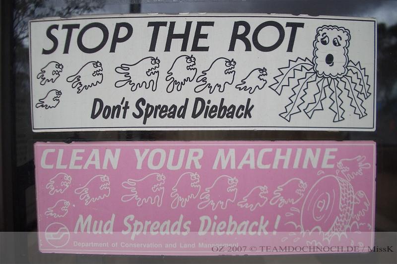 In Jerramungup erreichen wir den Highway 1 wieder, ein Unterschied ist aber nicht zu merken. Es geht weiter nach Osten, wir halten kurz am Eingang zum Fitzgerald National Park und informieren uns über den Dieback Pilz, der viele der hier lebenden Pflanzen anfällt, zum Beispiel auch die Banksia.