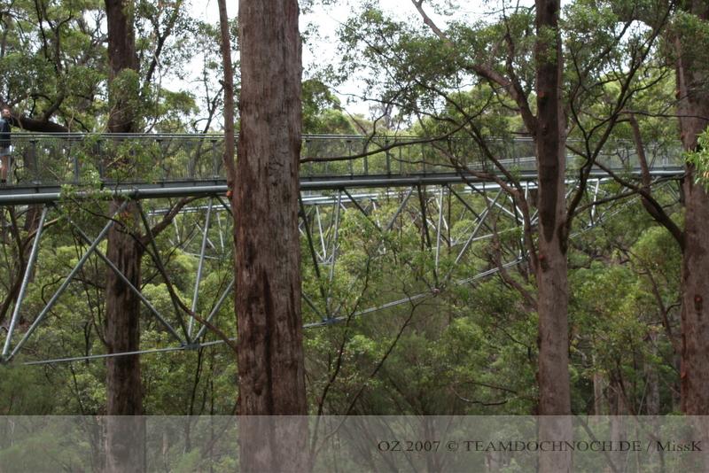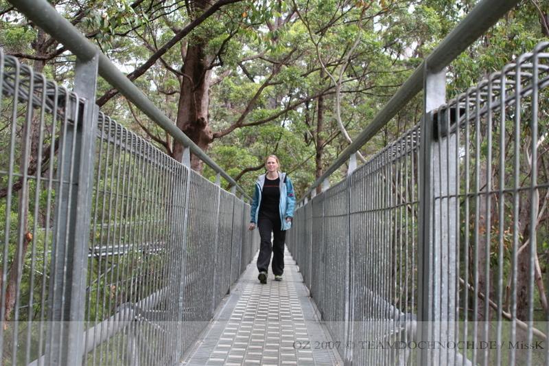 Der Tree Top Walk ist dafür eine geniale Sache. Der Eintritt ist zwar inzwischen auf 8 AUS$ gestiegen, aber dafür ist es eine schöne Erfahrung. Eine schiefe Ebene führt hinauf bis in die Wipfel der Bäume auf 40m Höhe und wieder hinab. Und wir haben Glück, wir sind zwar schon die deutschen Nr. 13 und14 heute, aber trotzdem ist es noch so leer, dass wir uns nicht bedrängt fühlen. Allerdings gibt es auch hier noch einen zweiten Parkplatz für noch mehr Touristen.