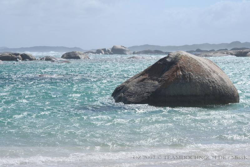 Obwohl der Highway 1 an der Küste entlang geht, ist vom Meer fast nichts zu sehen und so sind wir froh, als wir den Hinweis auf die William Bay sehen. Denn in nur 4 Kilometer Entfernung ist hier das Meer zu erreichen. Der William Bay Nationalpark schützt einen kurzen Küstenabschnitt in dem Felsen auf weißen Sandstrand treffen. Der Wind pfeift hier so, dass wir beim Laufen aufpassen müssen und die Brandung bricht sich an den Klippen weiter draußen.