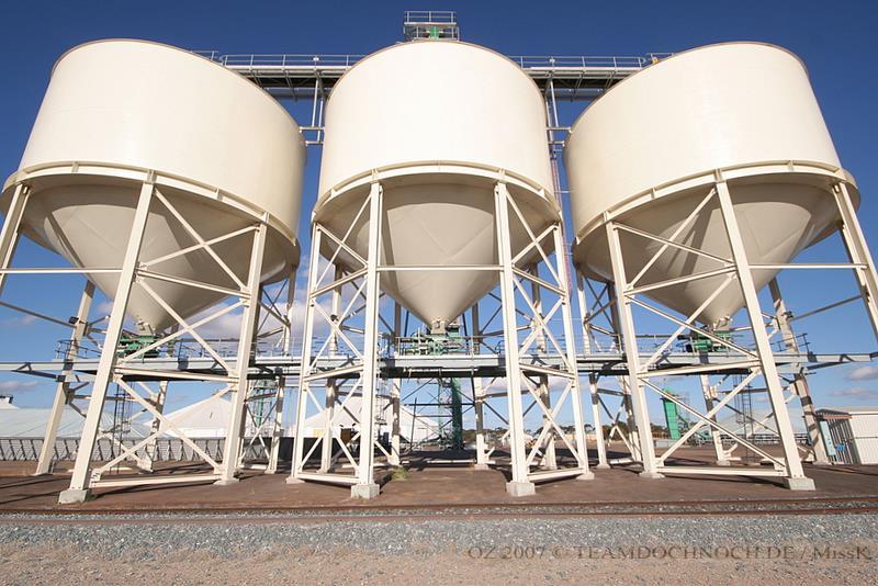 Es geht zunächst etwas aufwärts, aber nachdem wir eine Höhe von gut 250m erreicht haben, bleibt es eben bis hügelig, über 330 kommen wir heute nicht. Bis Salmon Gums gibt es es rechts und links noch Felder oder Weiden und unterwegs ein Paar Bahnhöfe mit riesigen Getreidespeichern. Ab hier gibt es dann aber nur noch Busch und keinen Hinweis auf eine Farm, nur rechts oder links Minen.