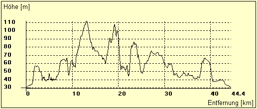 Die Länge der Tour beträgt ca. 45 Kilometer, dabei werden aber (zumindest fürs Flachland) auch viele Höhenmeter (gerade im ersten Teil) vernichtet, da es beständig rauf und runter geht.
