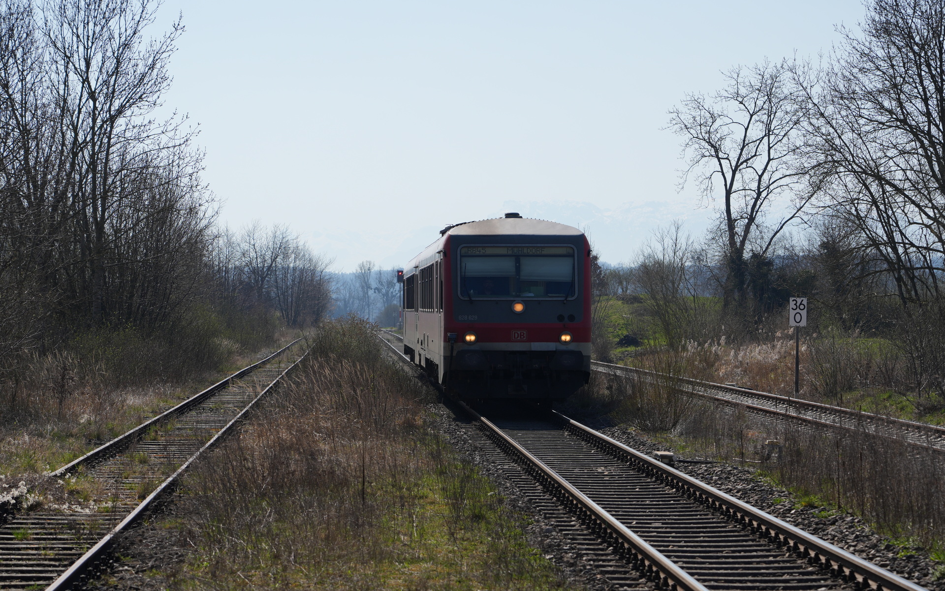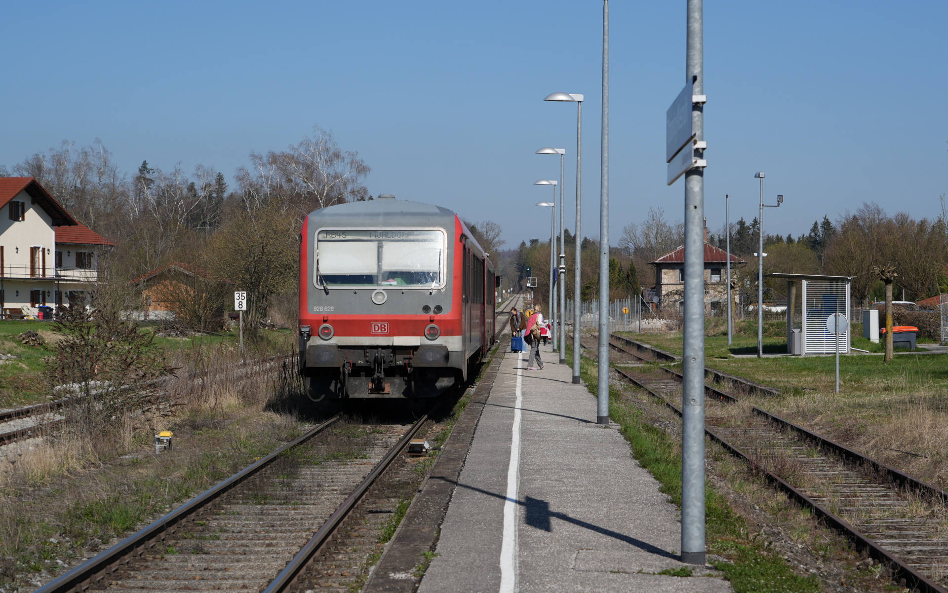 Aus dem scharfen Gegenlicht kommt 628 629 der DB AG nach Tittmoning-Wiesmühl und wird in Kürze als RB 45 weiter über Garching und Tüßling nach Mühldorf (Inn) fahren. Obwohl es mitten am Vormittag ist, steigen einige Passagiere ein und aus.