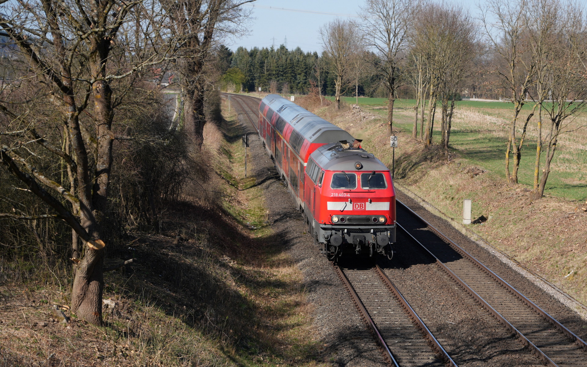 Südlich von Weiden überrascht mich 218 403-4 mit ihrem Regionalexpress RE2 nach München etwas. Ich stehe an der Bahnstrecke Regensburg–Weiden nicht weit von Luhe-Wildenau.