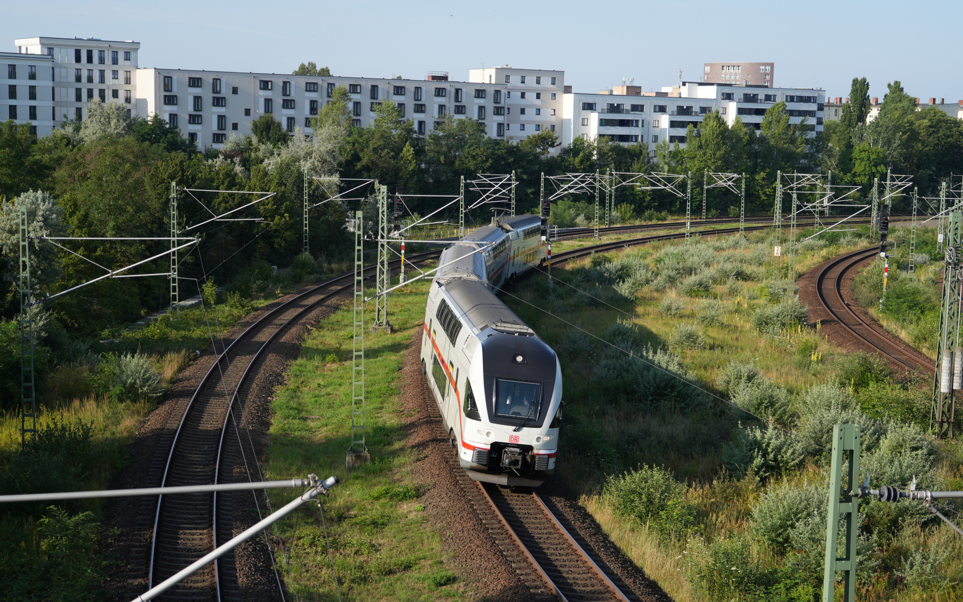 Die Stadler KISS der DB AG sollen an die ÖBB verkauft werden, insofern ist es bald ein historisches Bild, dass ein KISS als IC 2274 nach Rostock Hbf den Bahnhof Gesundbrunnen durch das Gleisdreieck und unter der Behmbrücke hindurch verlässt. Der Triebwagen fährt mit dem 2. Führerstand voraus, die Nummer lautet 4110 612.