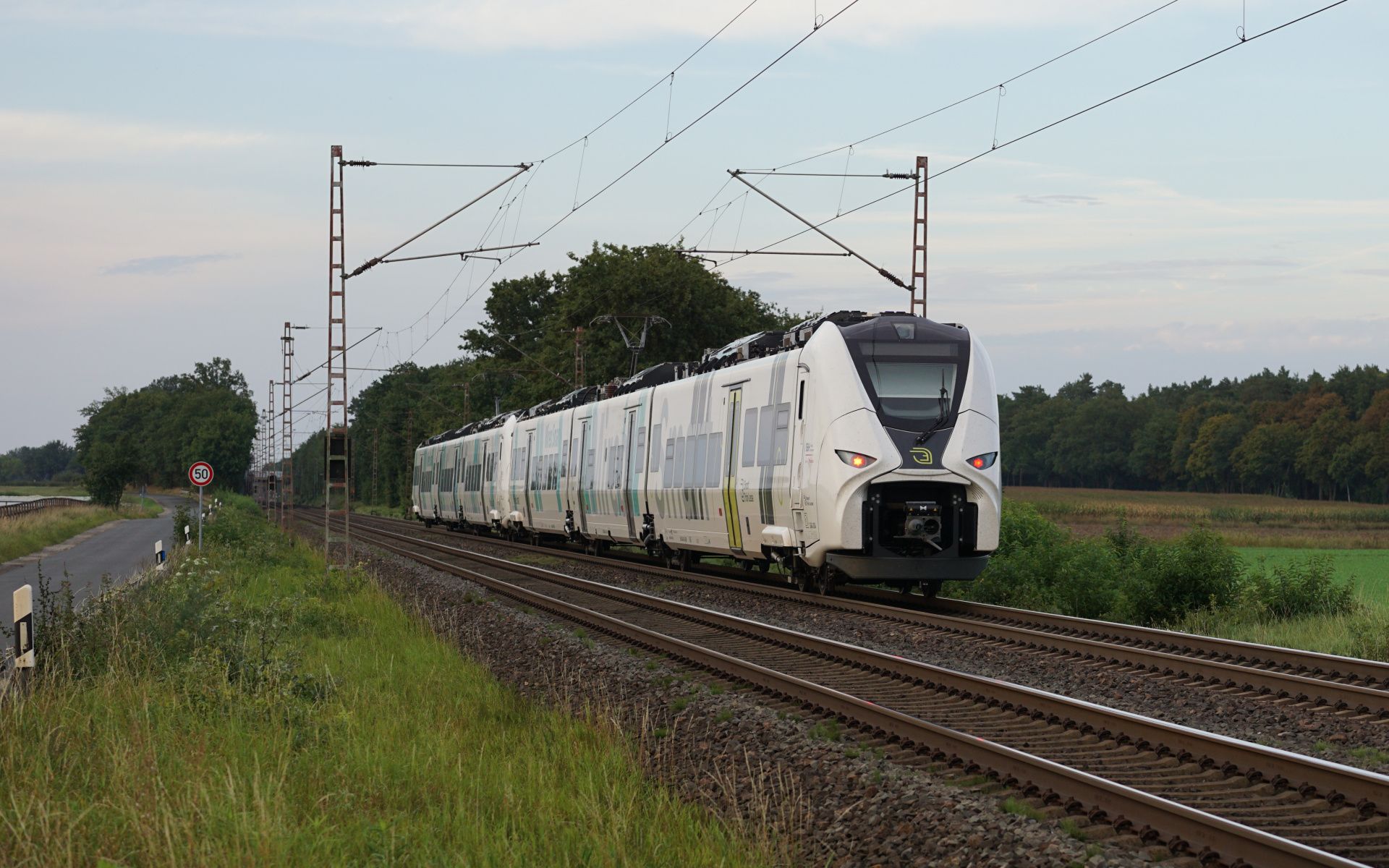 Der Mireo Smart verkehrt seit wenigen Wochen im Raum Hannover. Die Züge wirken noch sehr frisch. Hier fährt 3464 102 (an der Front) als S6 nach Celle unter der Brücke der B188 nördlich von Burgdorf hindurch. Seitlich steht dagegen die Nummer 002.