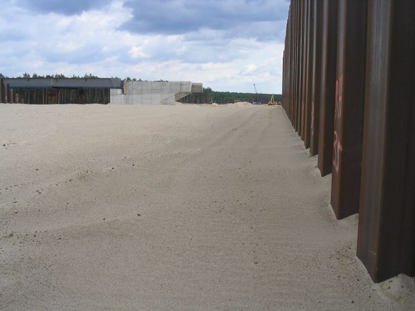 Rechts steht die Spundwand für den Fangedamm, der alte und neue Dusterwinkelbrücke für die Bauzeit verbindet.