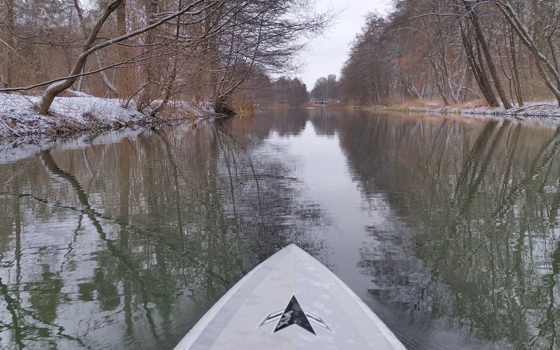 Die Rinne des dünnsten Eises war im Schnee noch zu erkennen und so beschloss ich, mein Paddelbrett als Eisbrecher zu benutzen und arbeitete mich langsam Richtung Mäckersee durch.
