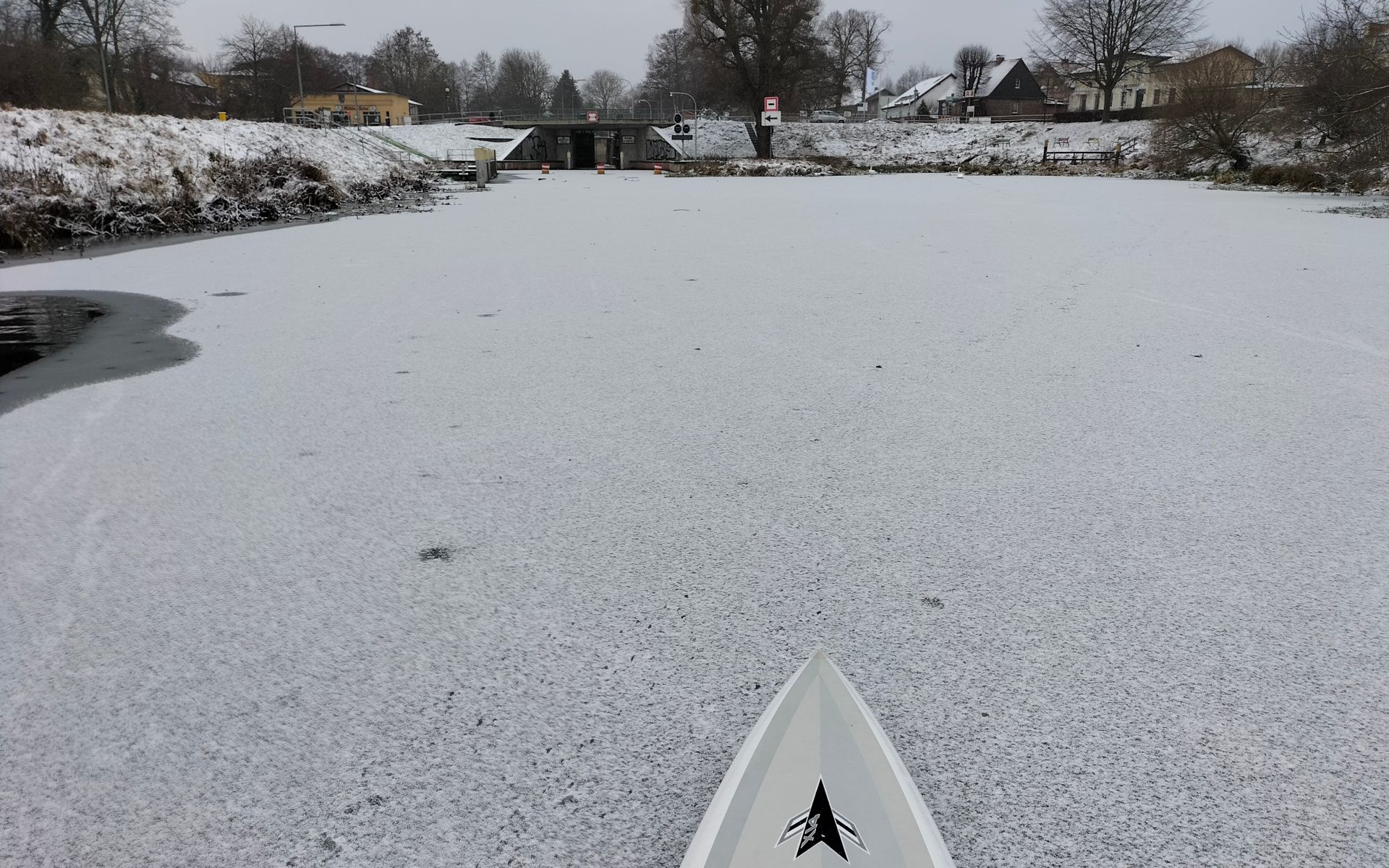 Ich fuhr zunächst in Richtung Schleuse Schöpfurt, kam aber nur bis zur Finow, ab da war der untere Vorhafen mit einer starken Eisdecke bedeckt.