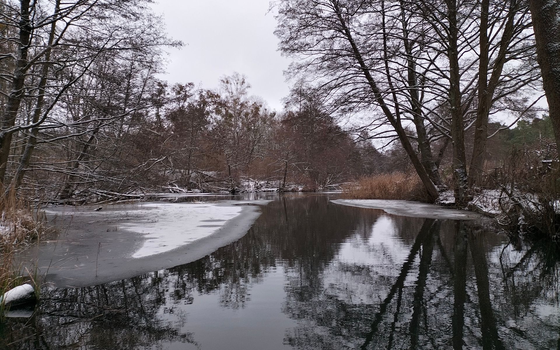 Ich kam aber nur ungefähr 500 Meter weiter, ehe ich wieder vor einer geschlossenen Eisdecke stand. Es war nicht abzusehen, wie weit das Eis reichen würde, aber irgendwo weit hinter der Kurve lag der Mäckersee, bei dem ich sowieso von einer geschlossenen Eisdecke ausgegangen bin.