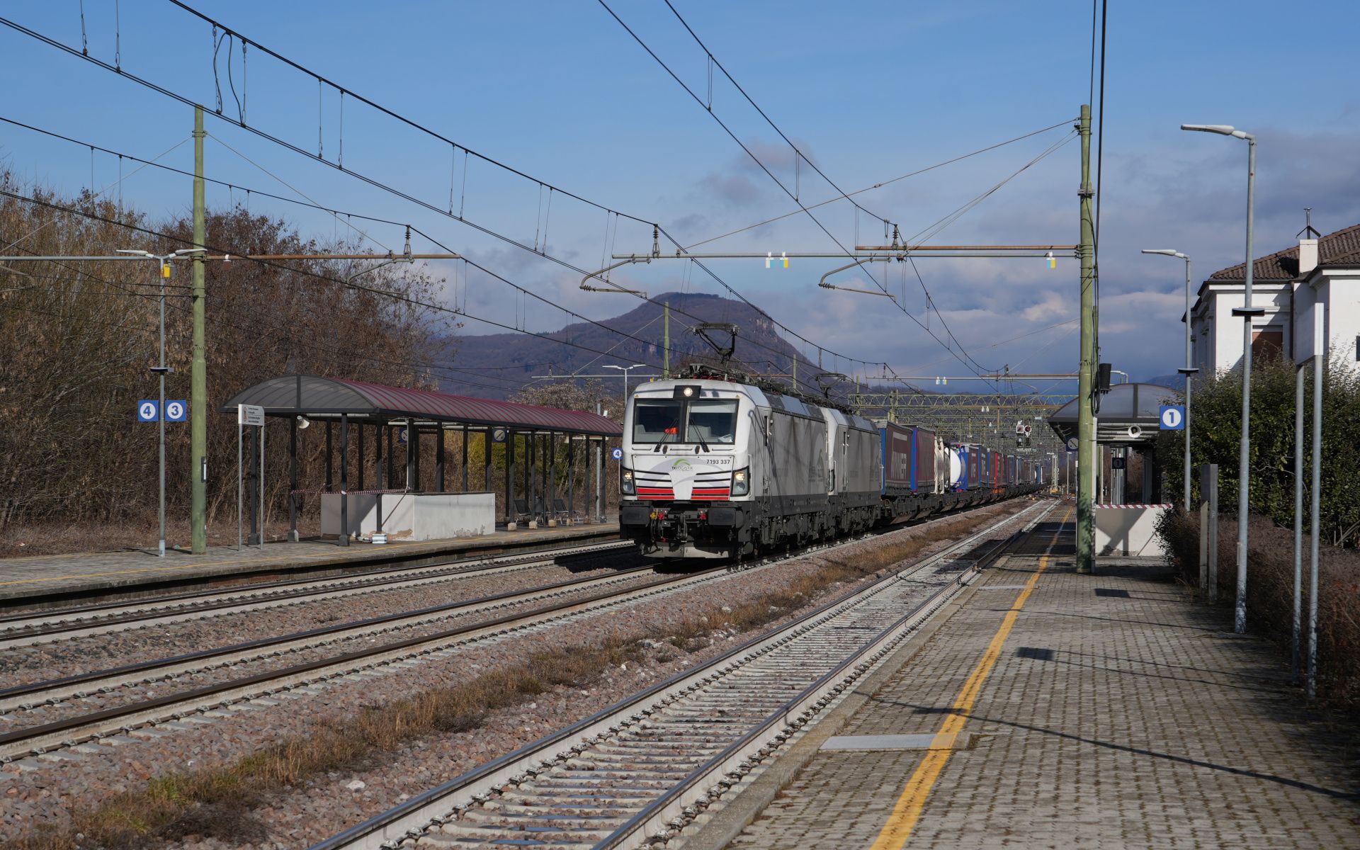 Nach dem vielen Personenverkehr kommt dochnoch mal wieder ein Güterzug mit Kombiniertem Verkehr und zwei Vectron durch den Bahnhof Egna-Neumarkt.