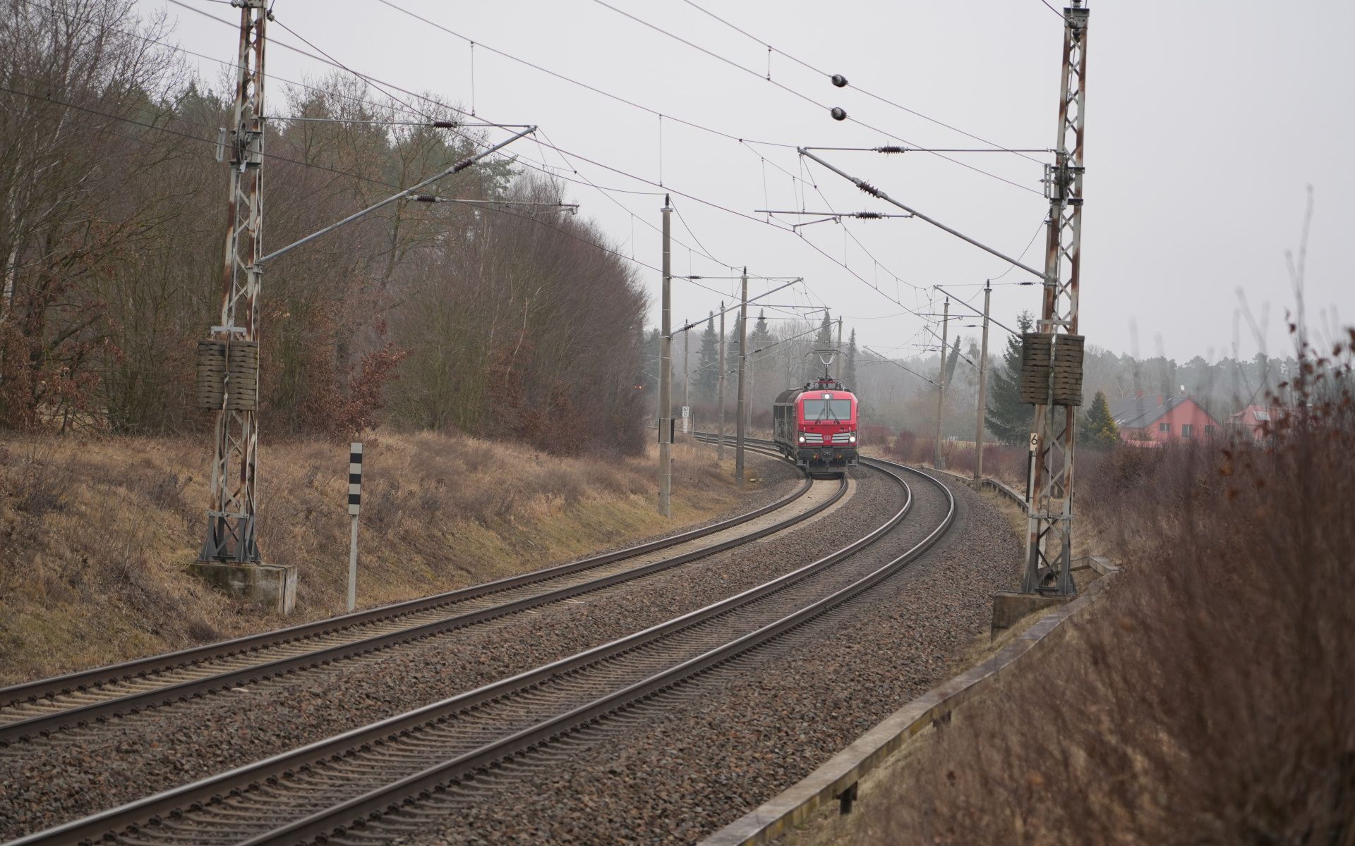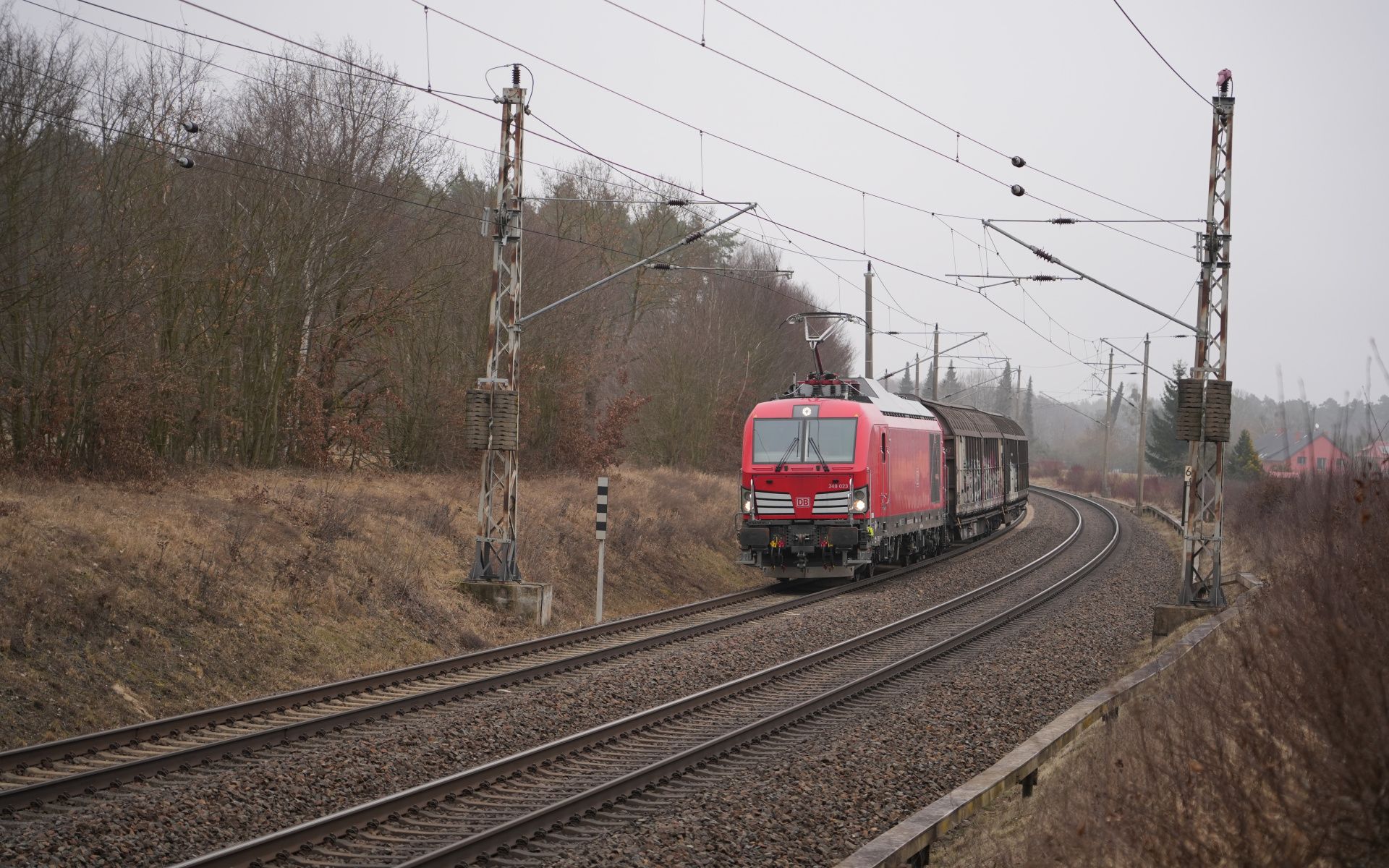 Bei Serwest kommt 249 023 der DB AG mit nur zwei Schiebewandwagen um die Kurve. Ein Zug der auf jede moderne Modellbahn passen sollte.
