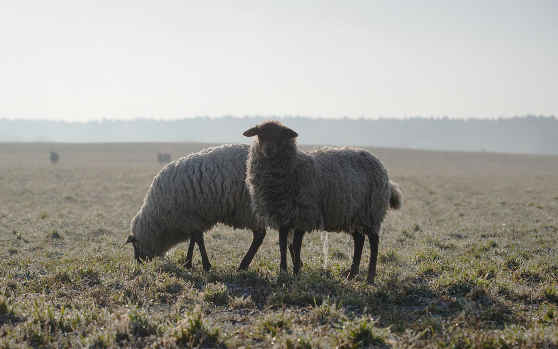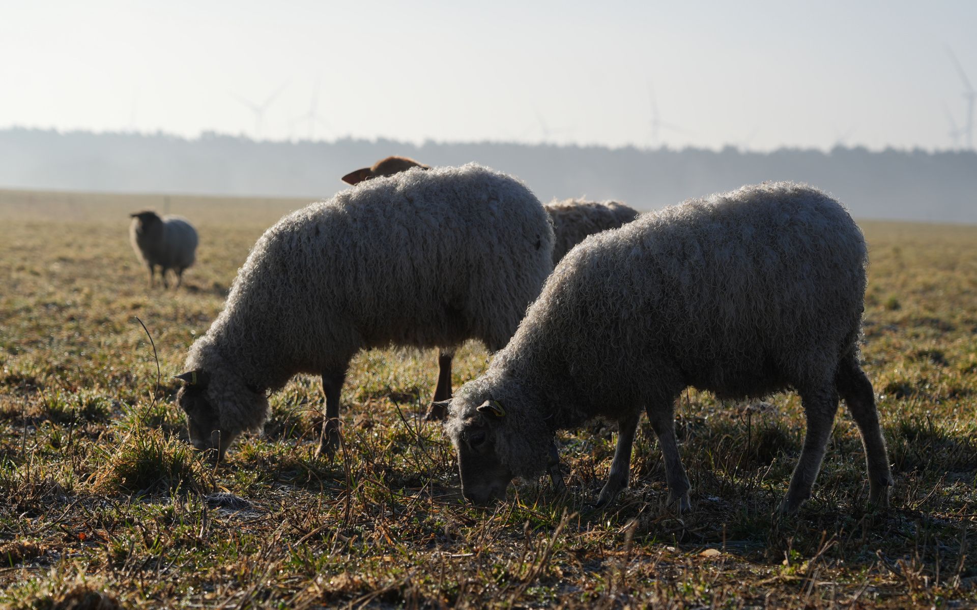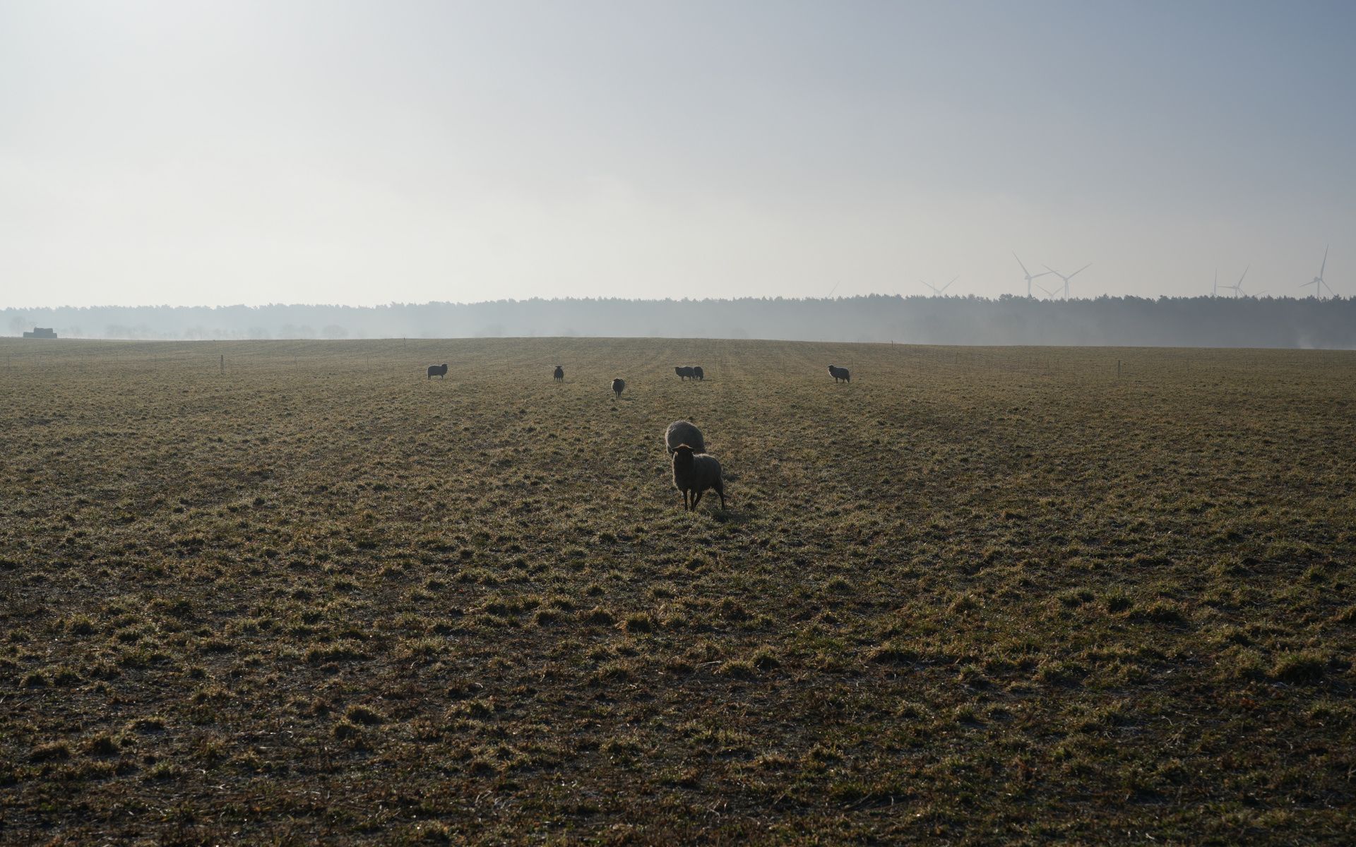 Es ist noch einmal ein frostiger Morgen bei Danewitz. Die Schafe tragen noch ihr Winterfell und einige schauen neugierig herüber.