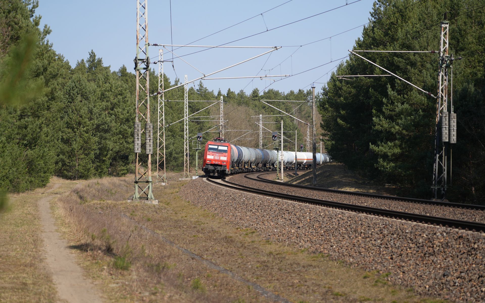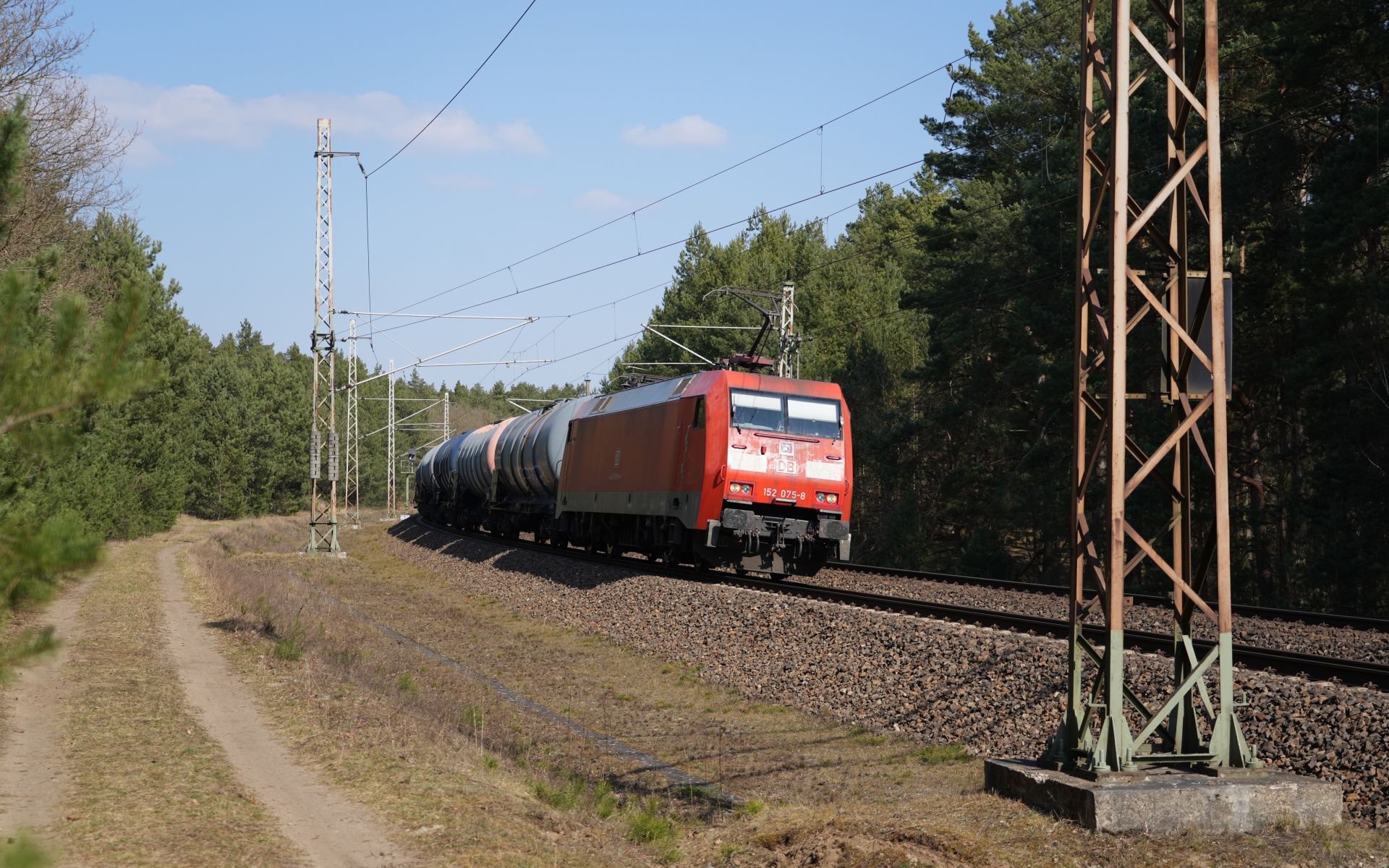 Bein einem Mittagsspaziergang in Britz sehe ich 152 075-8 mit einem Zug aus Kesselwagen zwischen Britz und der Bahnunterführung unter dem Oder-Havel-Kanal (Havel-Oder-Wasserstraße – WSA Oder-Havel).