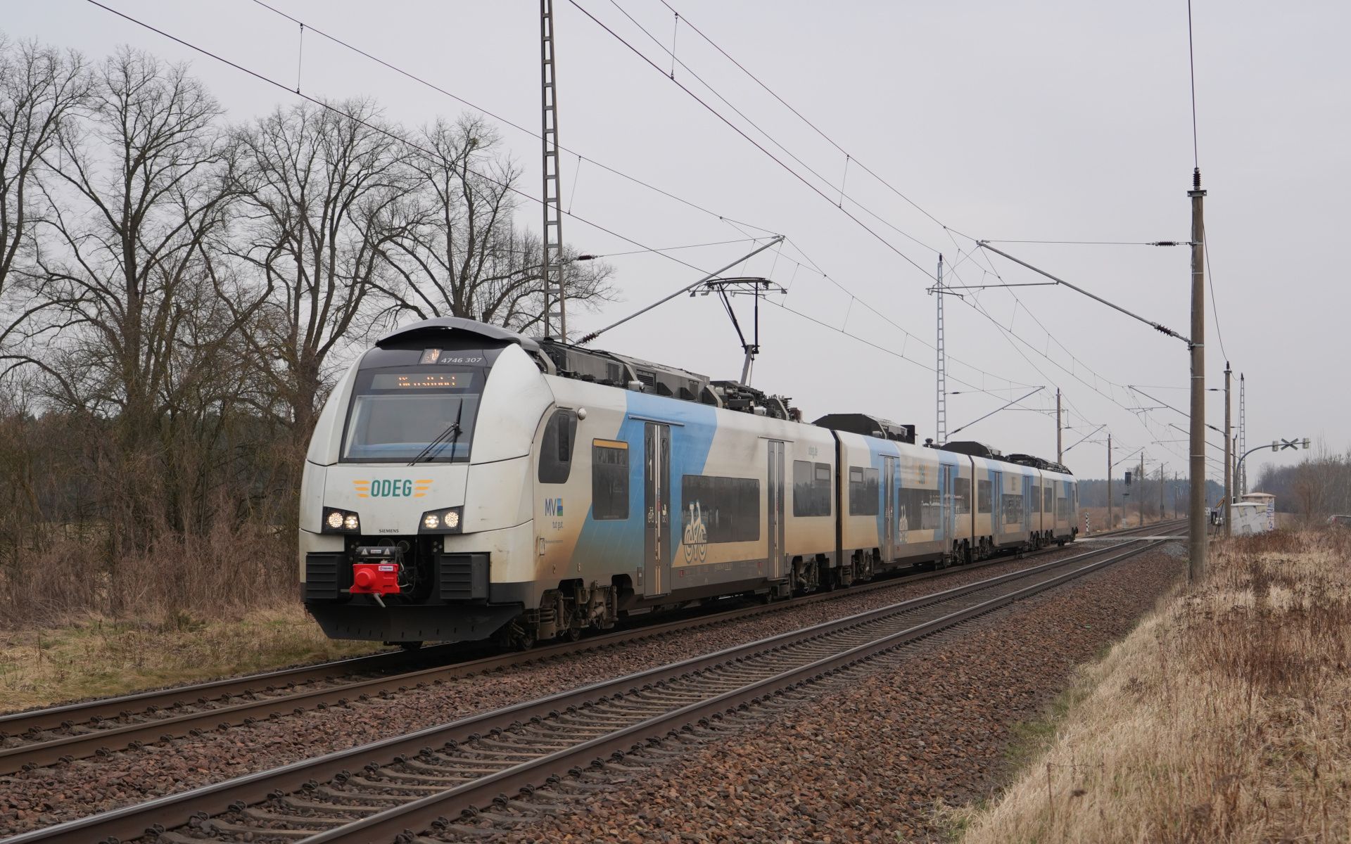 Bei Danewitz treffe ich einen Desiro ML der ODEG (4746 307), der früher einmal bei der ÖBB fuhr. Eigentlich sind diese Triebwagen in Mecklenburg-Vorpommern unterwegs, hier ist es eine Überführung von der Werkstatt in Eberswalde nur wenige Kilometer nördlich von hier. Ein Modell dieses Triebwagens (4746 302) ist auch in H0 erhältlich von Jägerndorfer, z.B. bei Modellbahn-Union erhältlich.