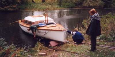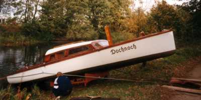 Es beginnt alles damit, dass wir das Boot quer in den Kanal stellen (aber erst wenn alle anderen Schiffe durch sind) und das Geschirr anbringen, mit dem wir das Boot herausziehen. Das schwierige ist, den Rumpf in die richtige Position ueber den Wagen zu bringen und anschliessend den Wagen auf der Spur zu halten.