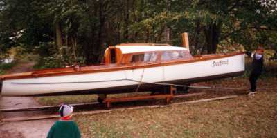 Der Erste, wenn das Schiff mit dem Bug auf die relativ steile Boeschung kommt, dann schabt es ueber die bereitliegenden Matrazen und alles laeuft etws schwerer. Das Unterwasserschiff wird etwas strapaziert. Sowie alles wieder leicht laeuft und nur noch das Gewicht des Schiffes am Haken haengt geht es einfacher.