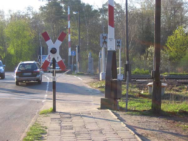 Am Bahnübergang Tierpark wir die Schrankenanlage komplett umgebaut. Im Vordergrund ist die alte Schrankenanlage und Andreaskreuz zu erkennen, im Hintergrund die bereits montierten aber noch funktionslosen Neuen.